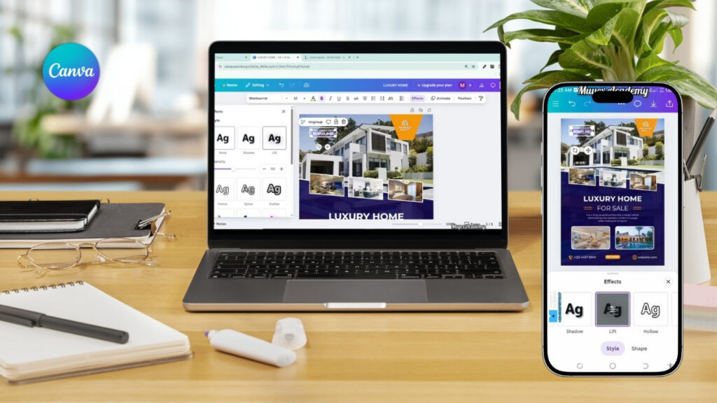 Create stunning social media designs, presentations, flyers, and marketing materials using Canva on both phone and PC.